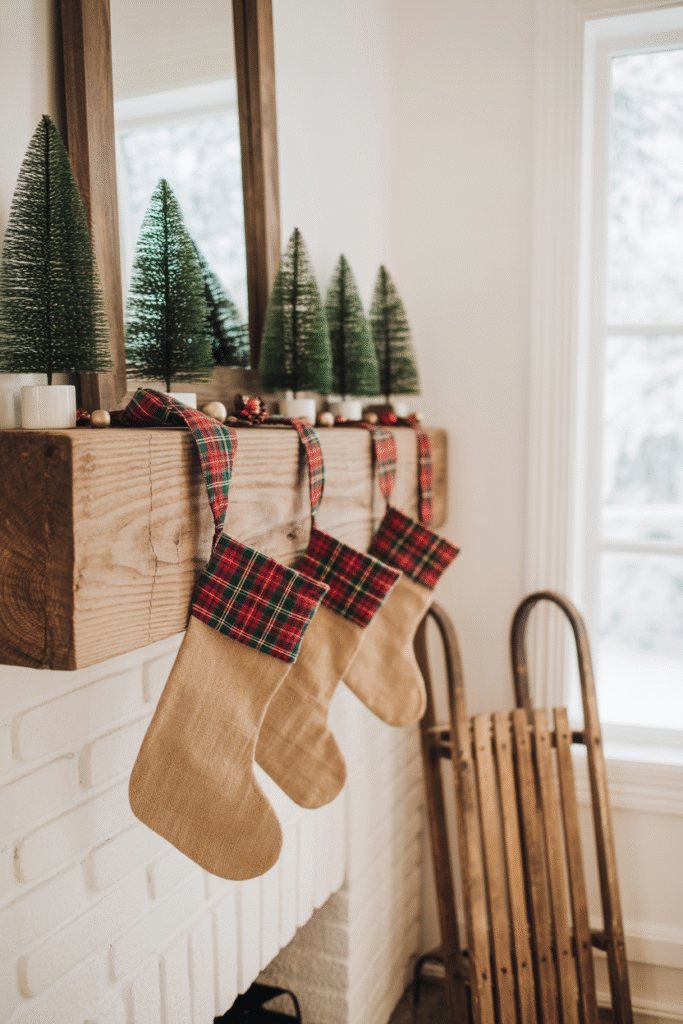 Love that “fixer-upper at Christmas” vibe? Layer wood slices, plaid ribbons, and mini pine trees on your mantel. Hang stockings from antique hooks or a vintage ladder. A small sled or wooden crate on the hearth seals the farmhouse feel.
