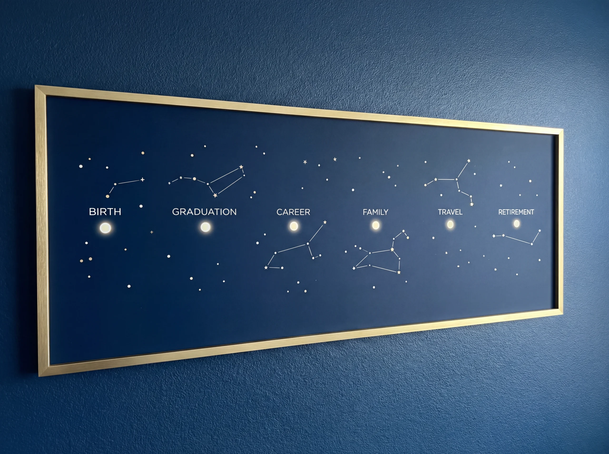 Instead of a basic welcome sign, create a constellation-style timeline of the parents’ story.