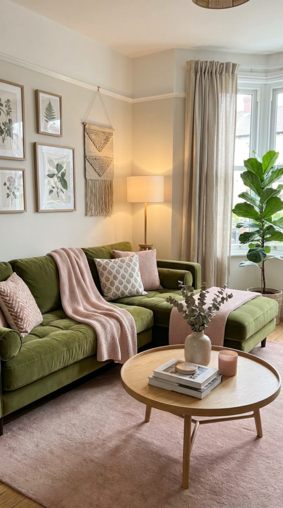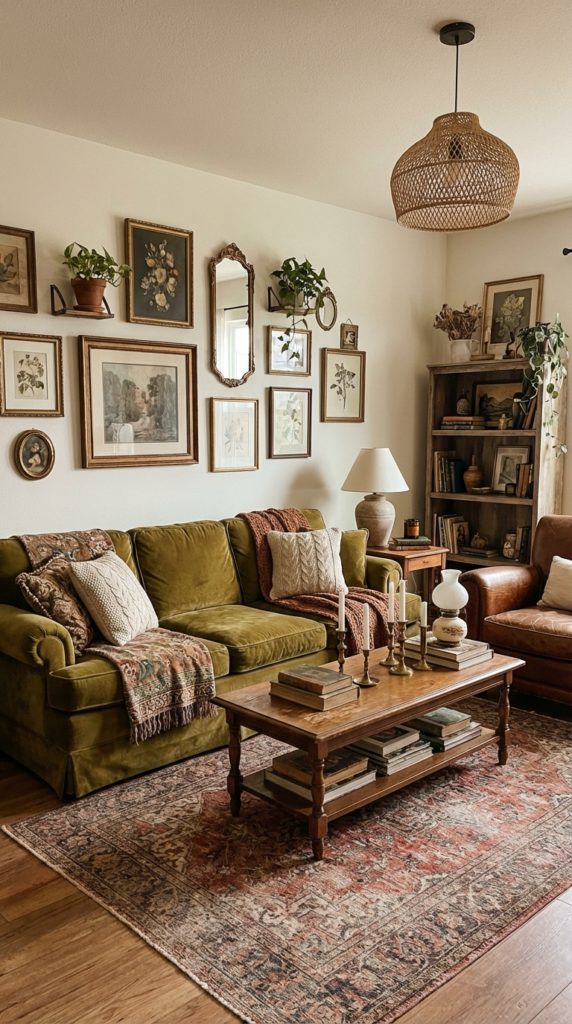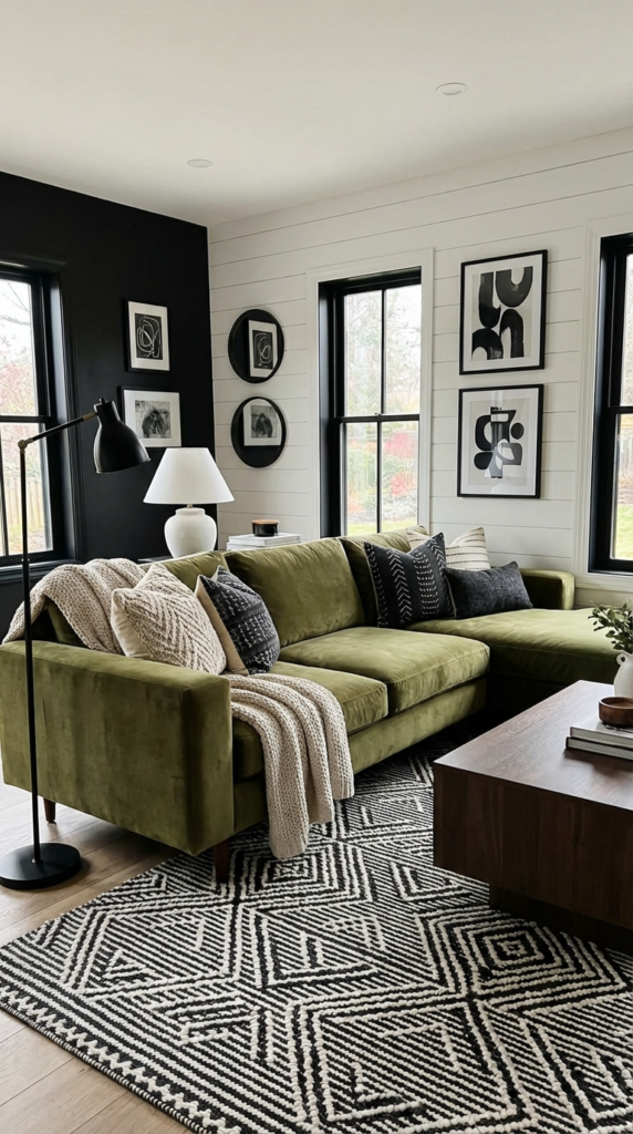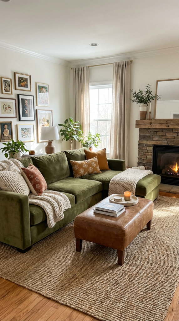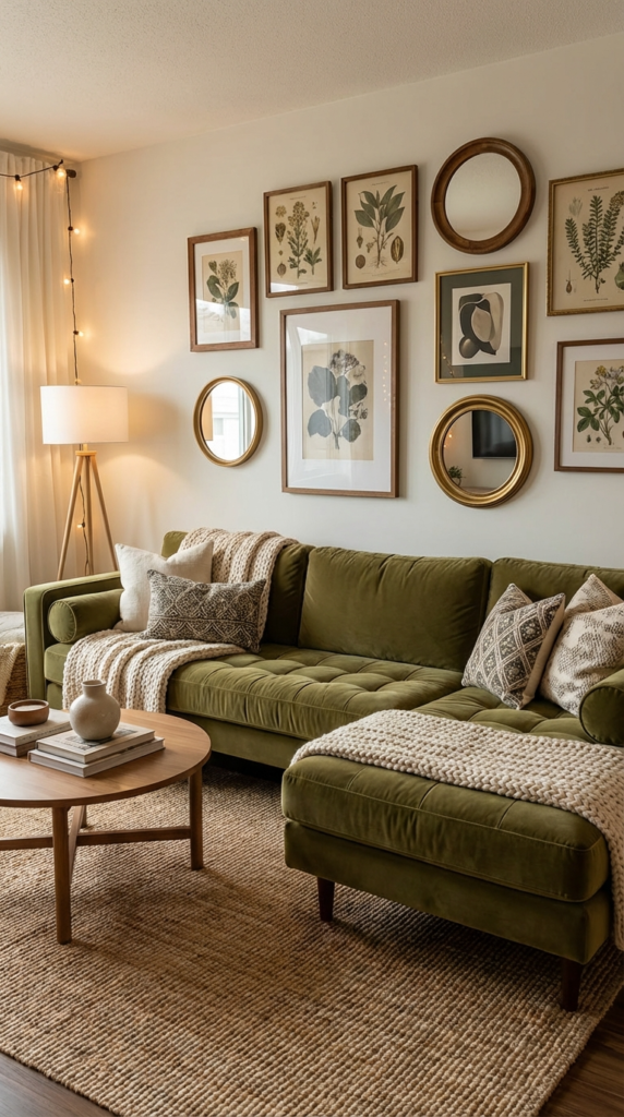 An olive sofa anchors art beautifully, especially with warm frames and mixed textures. This approach adds “lived-in chic” fast.