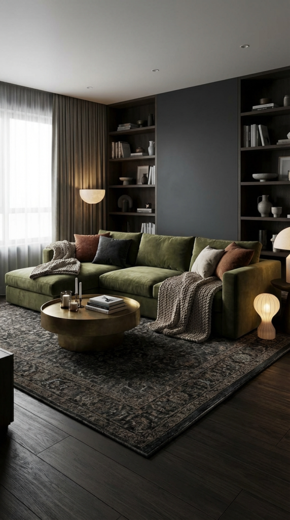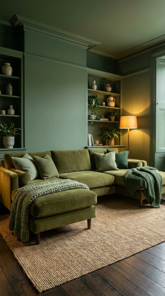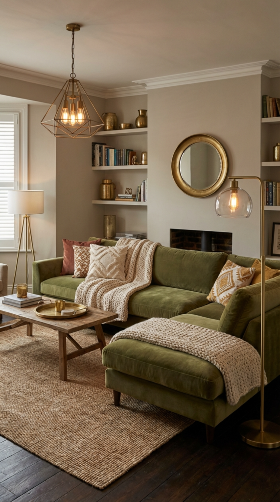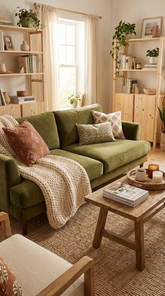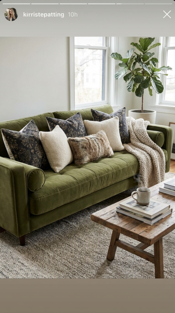 An olive velvet sofa turns the color into a statement. Velvet catches light, adds depth, and instantly upgrades the room’s mood.