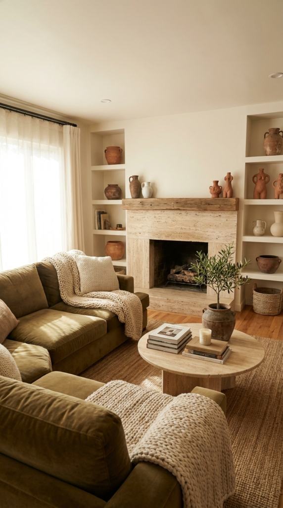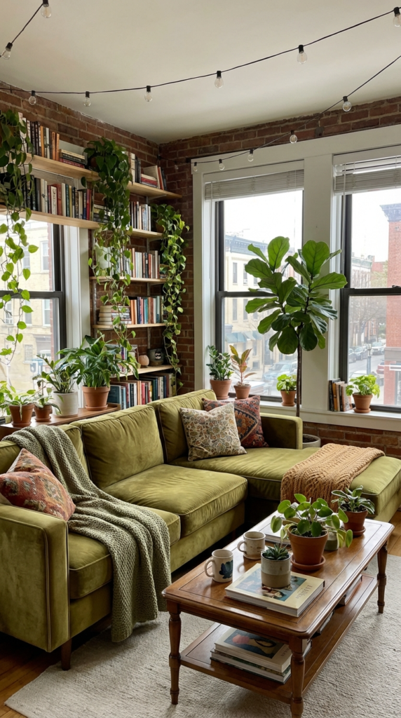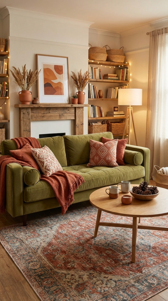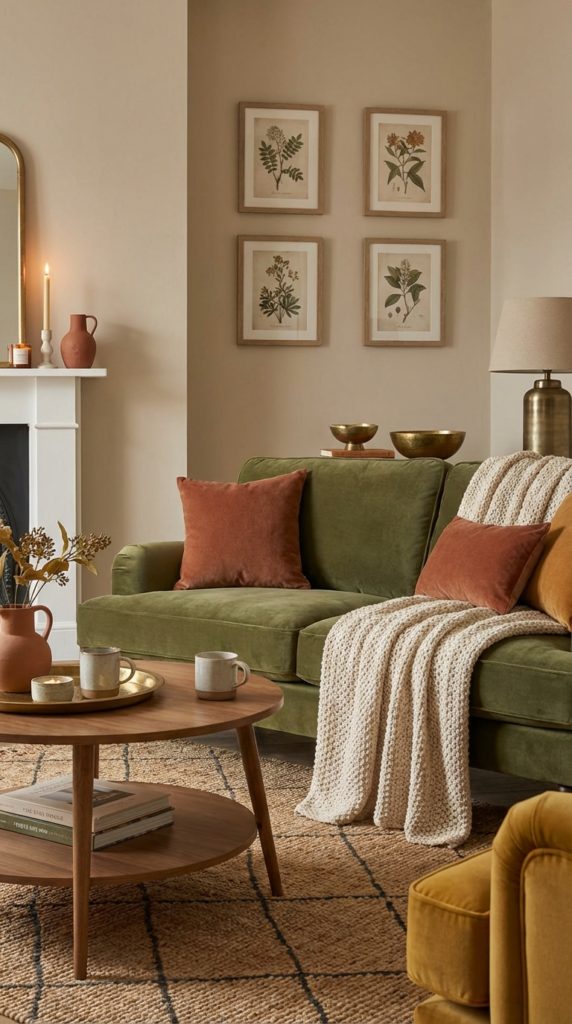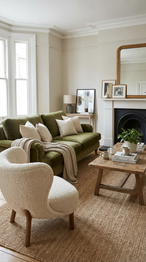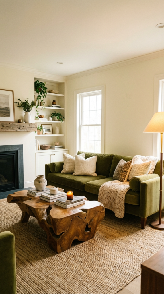 An olive velvet sofa turns the color into a statement. Velvet catches light, adds depth, and instantly upgrades the room’s mood.