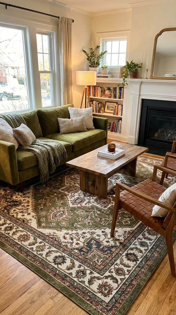 If olive feels tricky, let a rug connect the dots. A rug that includes green plus warm neutrals makes the sofa look perfectly planned.