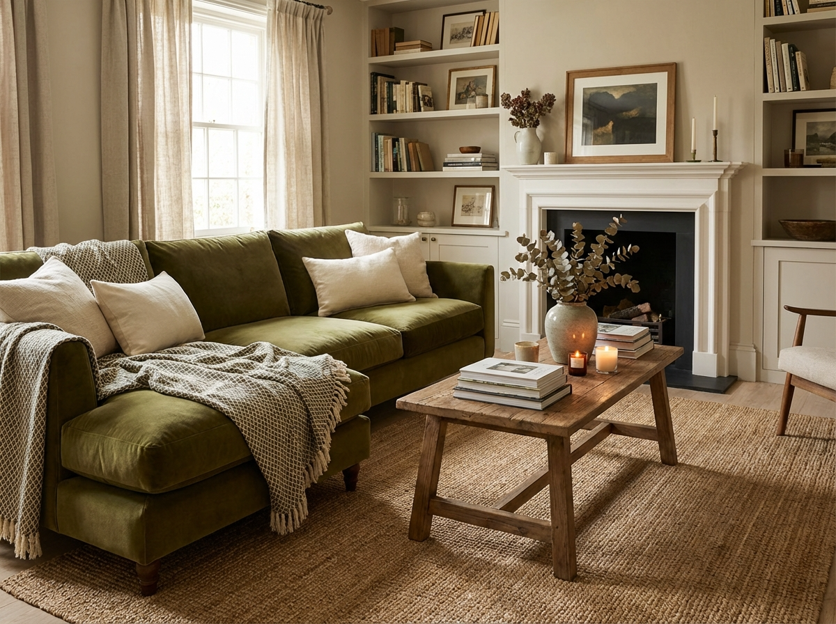 An olive green sofa sets a confident foundation—warm enough for cozy nights, rich enough for a chic, styled look. Lean into texture, pair olive with warm neutrals and wood, and choose a clear style direction (or mix two) so the room feels intentional.