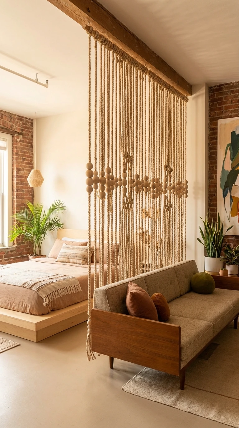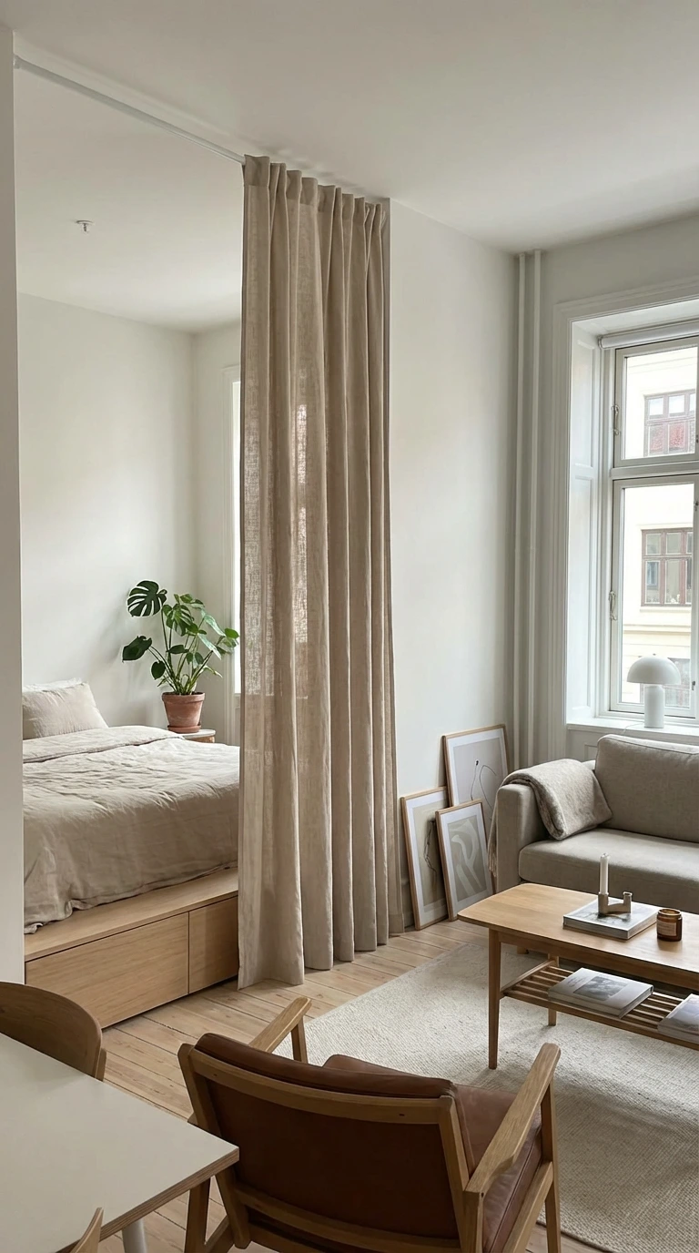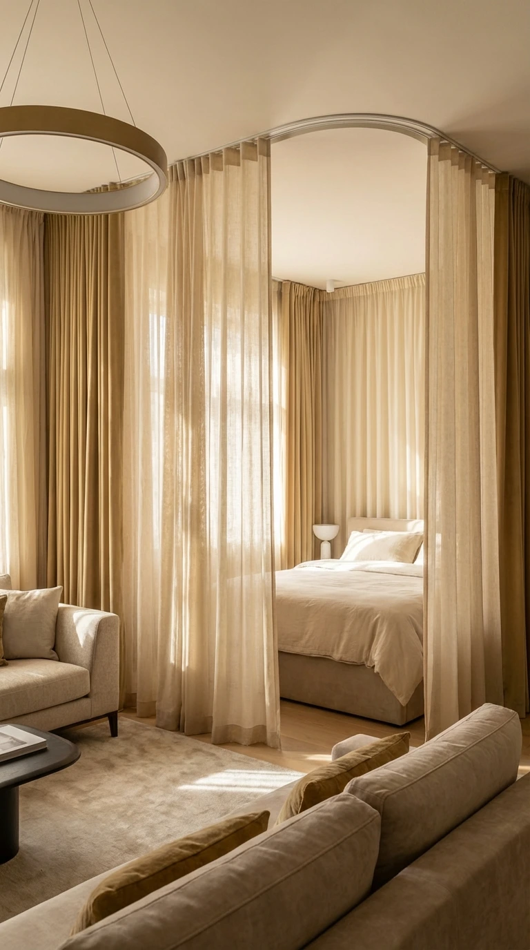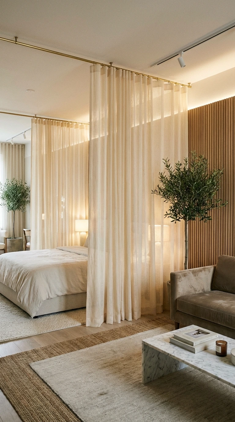 Soft curtains create instant zones and feel elegant when hung ceiling-high. Light fabrics keep the space airy, while heavier panels add drama and privacy for sleeping areas.