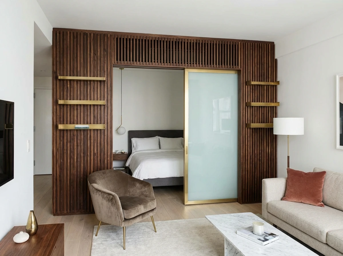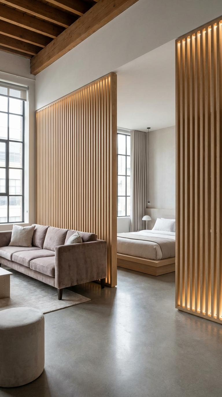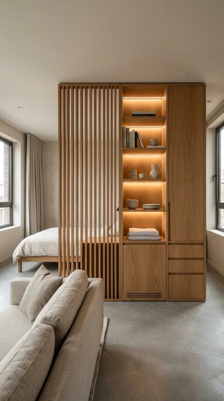 Vertical slats create architectural interest while allowing airflow and light. This option instantly elevates a studio into designer territory.