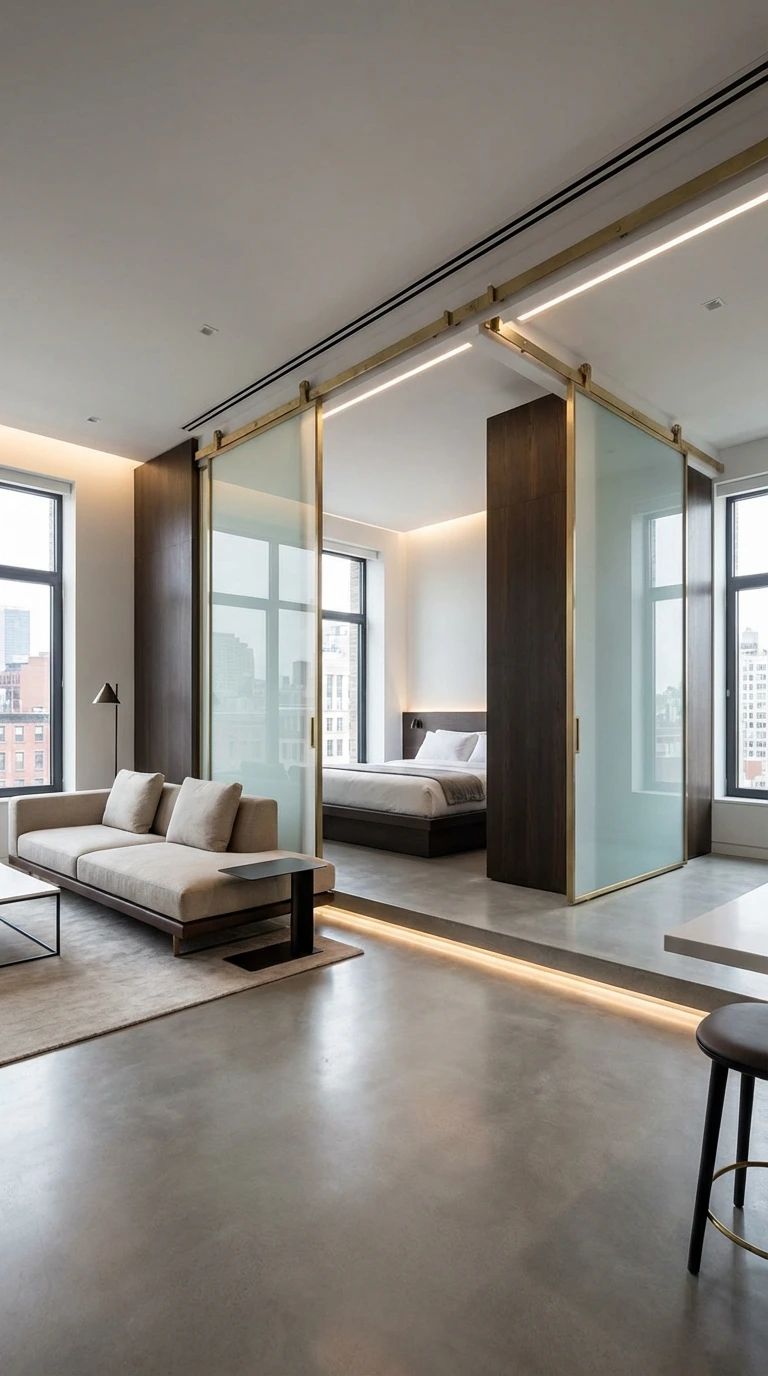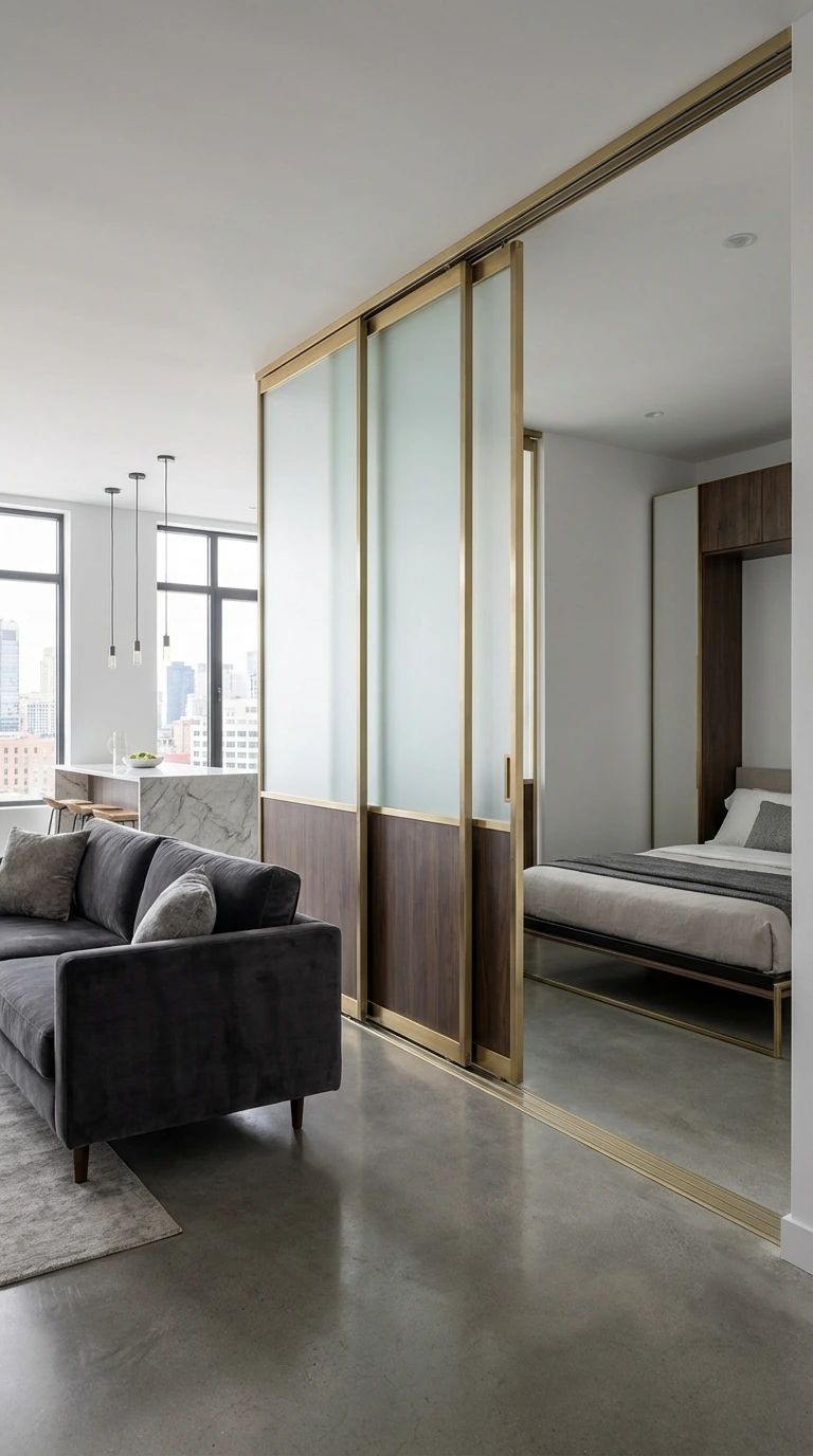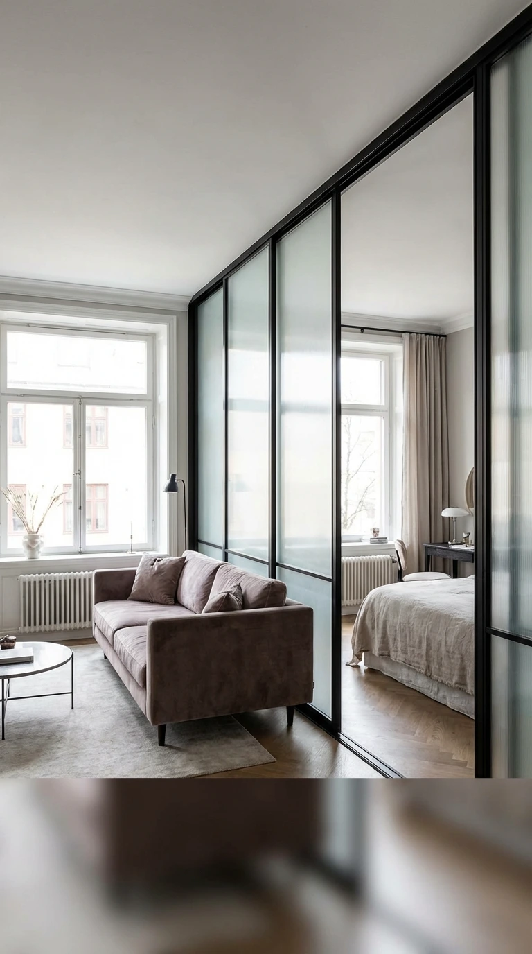 Clear or frosted panels define space without darkening it. Ideal for very small studio apartment ideas where light is precious.