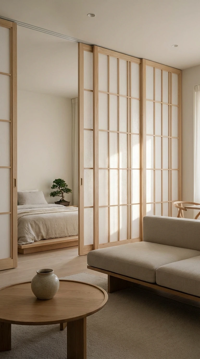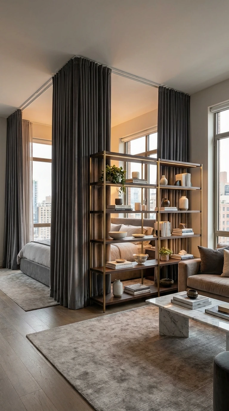 Opt for curtains on ceiling tracks, folding screens, or tall open shelving. These create strong visual separation while keeping flexibility.