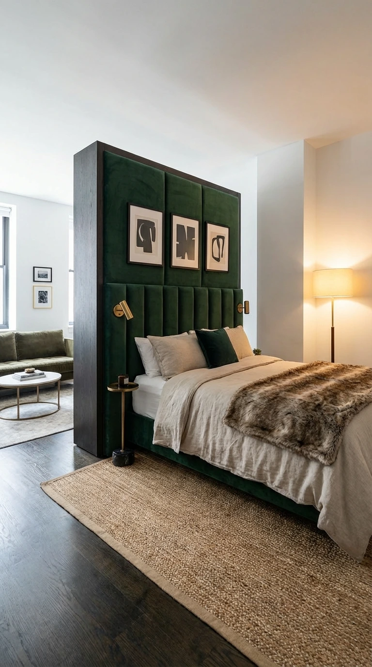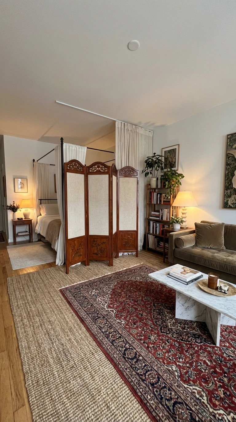 Pairing a screen with a rug defines a bedroom zone visually and physically. It works beautifully in narrow studio apartment layouts.