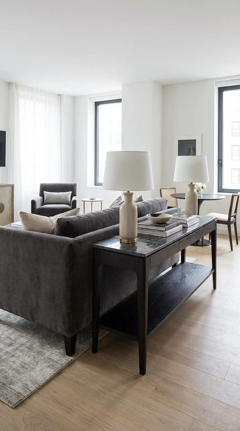 Placing a console behind the sofa subtly separates the living and sleeping areas while adding storage.