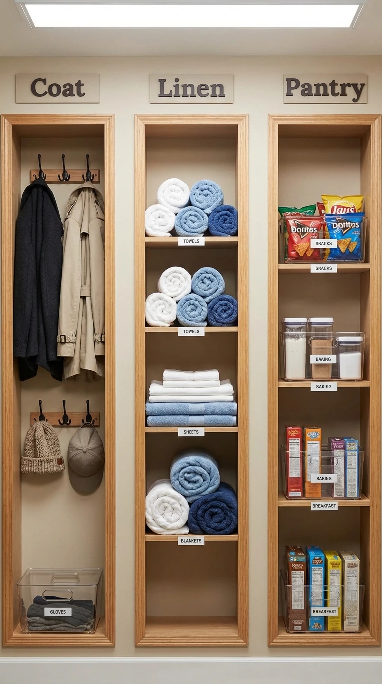 - Small linen closet organization ideas: roll towels and label shelf zones