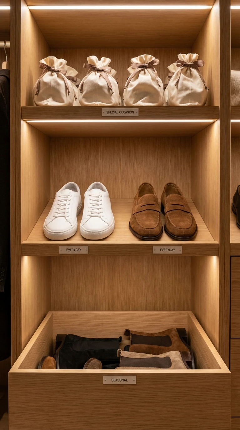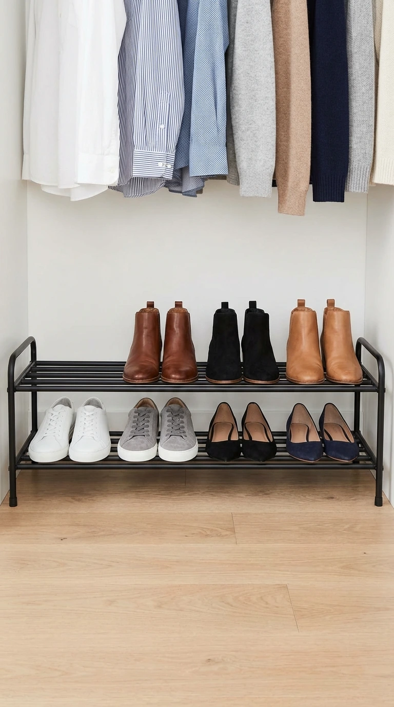 Put daily shoes at eye level. Special-occasion shoes go higher or in bins.