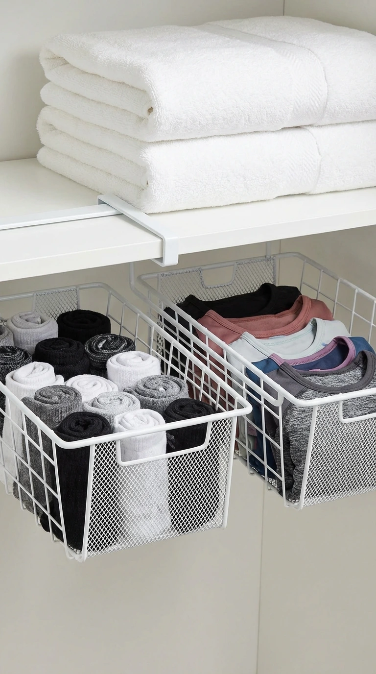 Slide-on wire baskets instantly add a drawer-like layer under a shelf.
