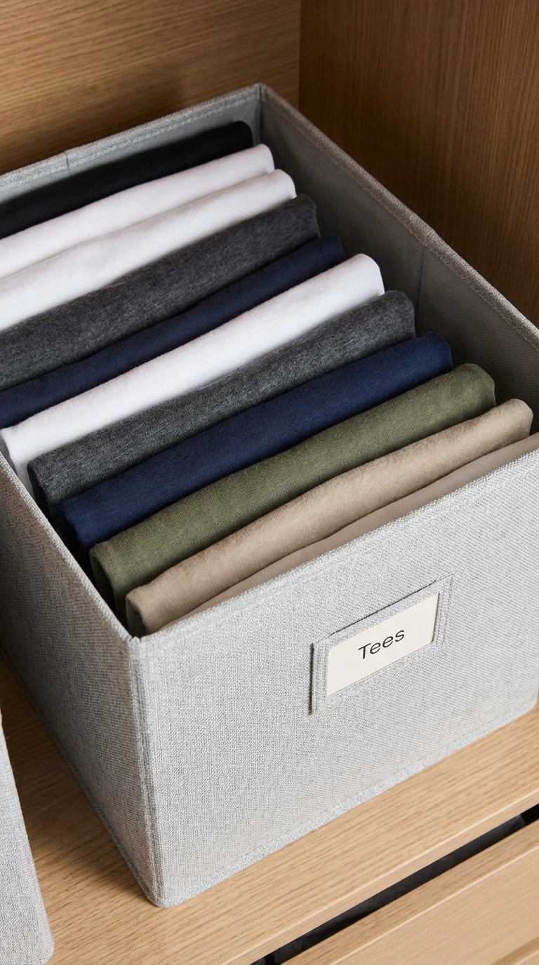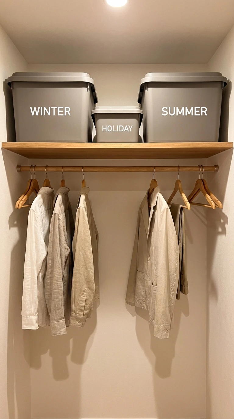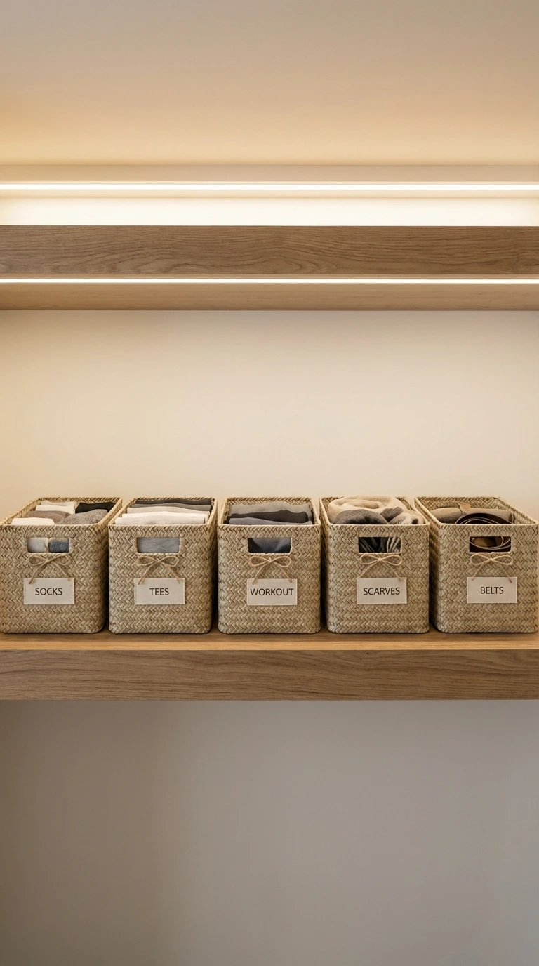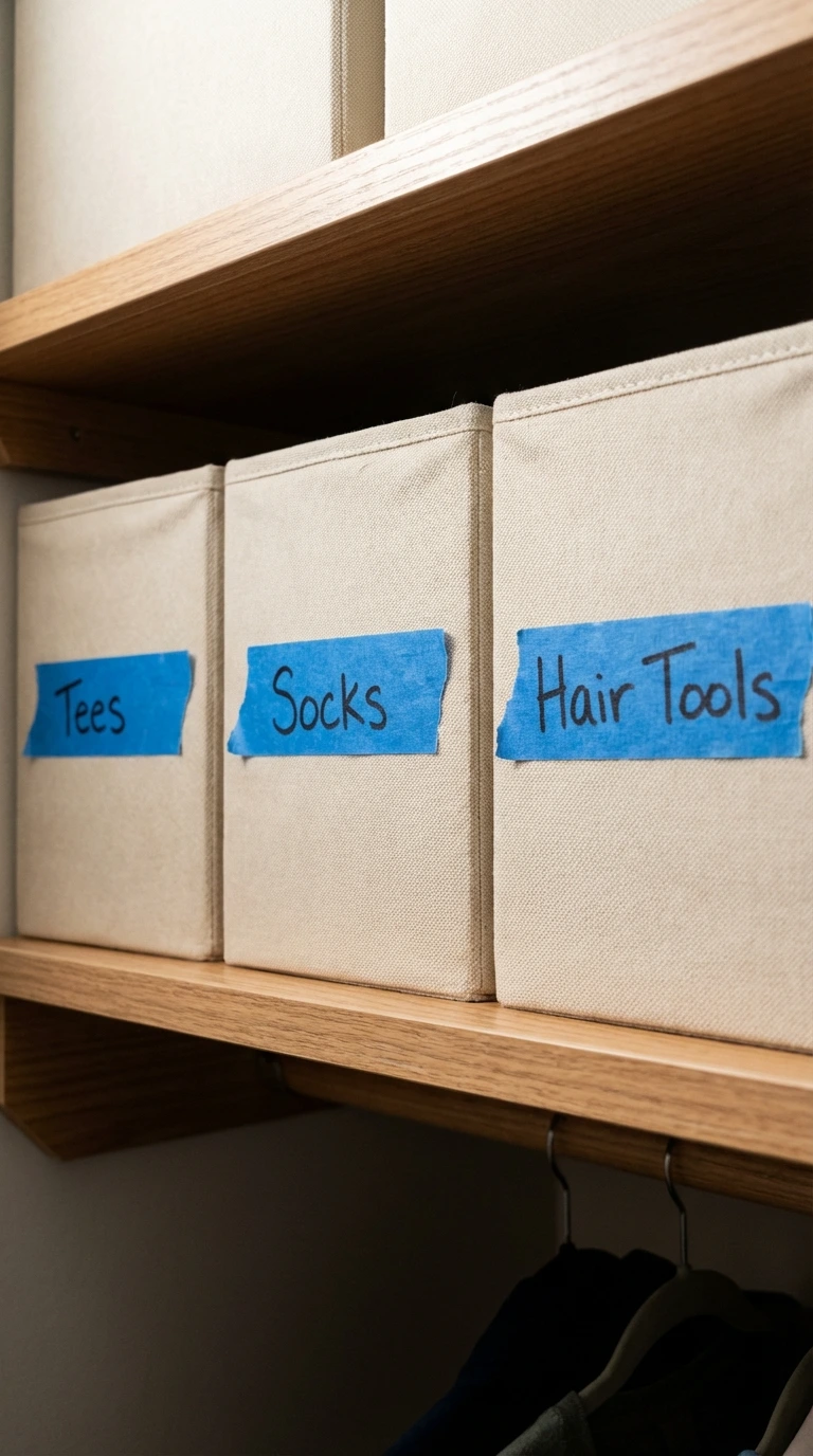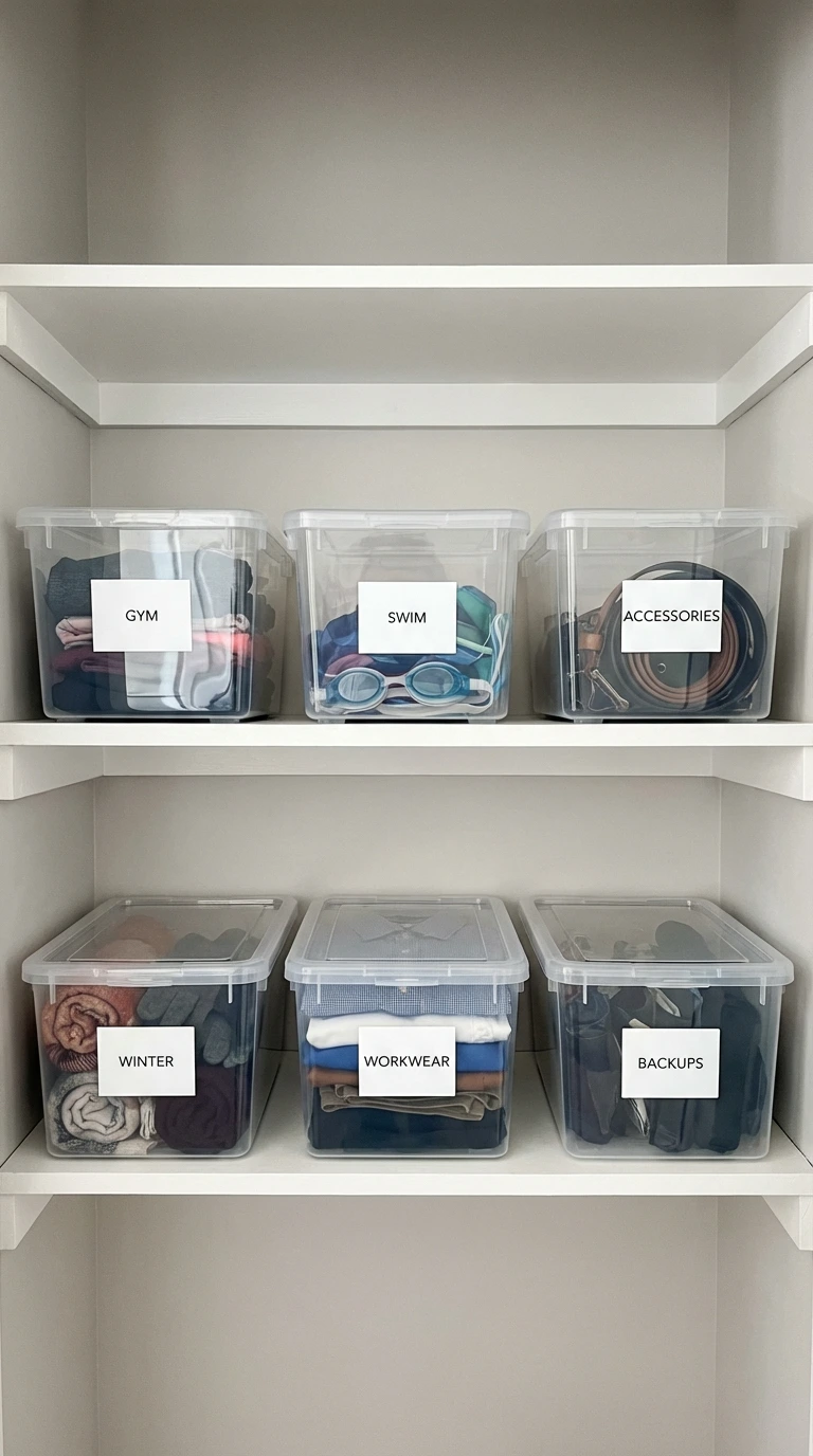 Pick 4–6 bins and label them: Gym, Swim, Accessories, Winter, Workwear.