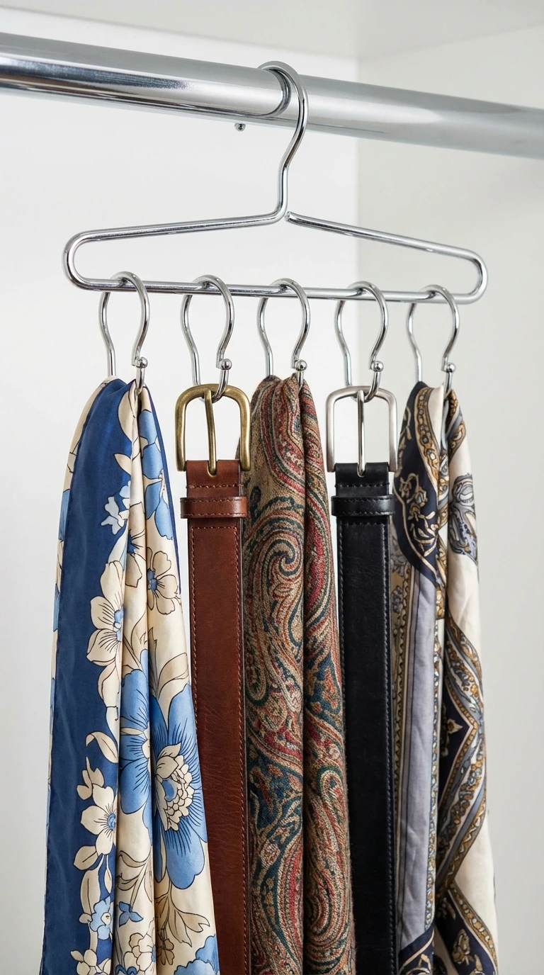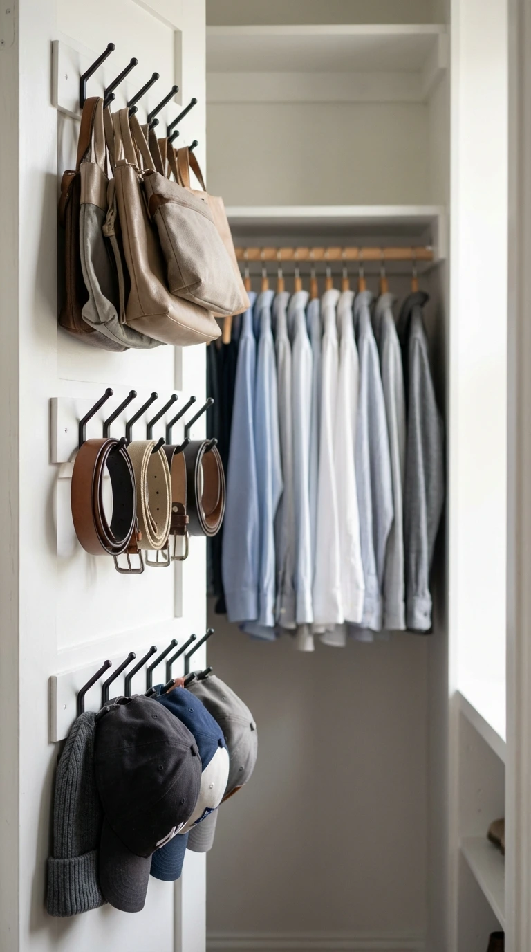 Empty side walls are prime real estate. Use hooks for belts, scarves, hats, bags.