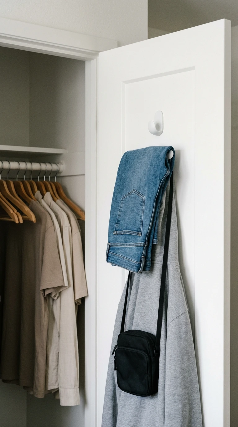 Mount one hook (or an over-the-door hook) for tomorrow’s outfit, gym bag, or handbag.
