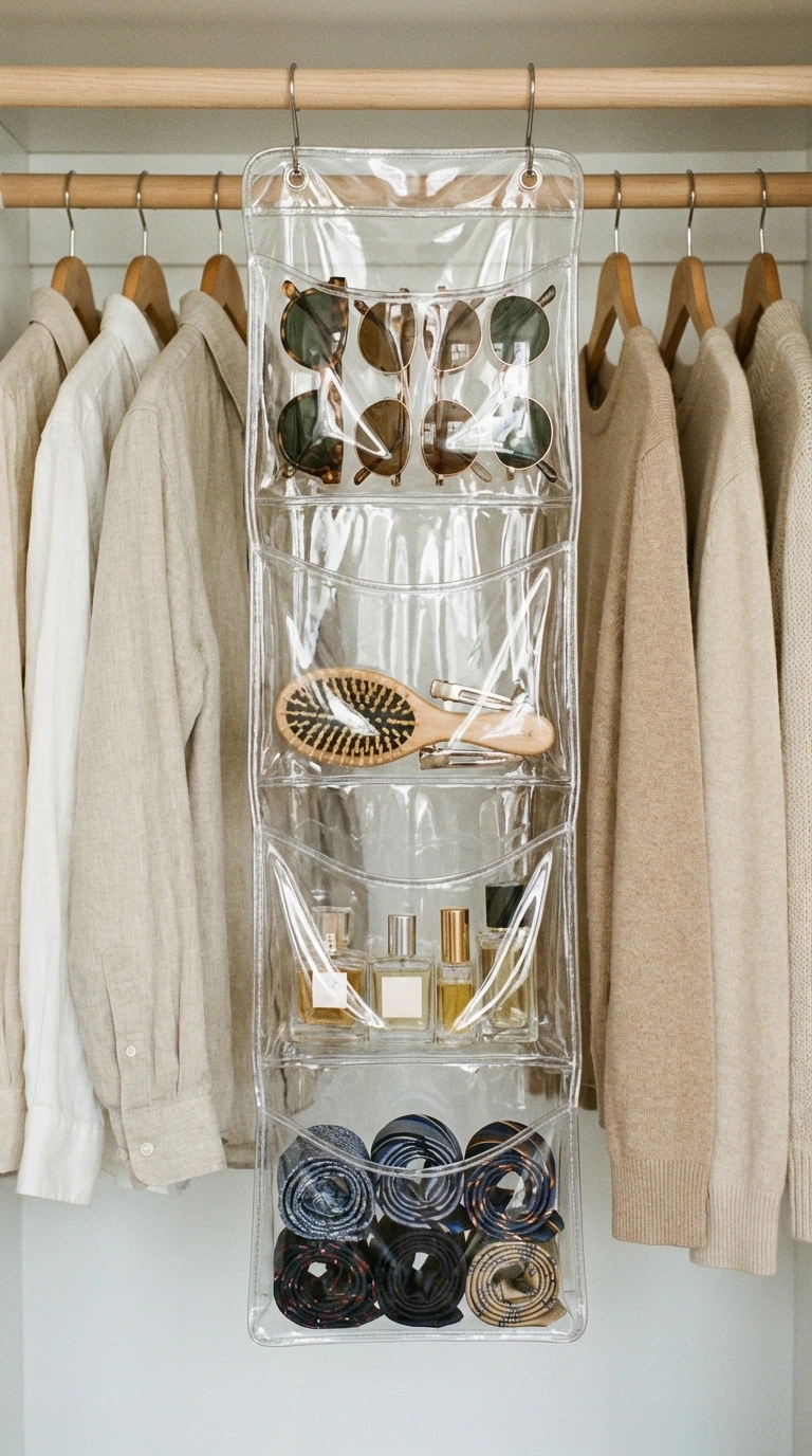 A hanging pocket organizer keeps sunglasses, hair tools, and jewelry visible.