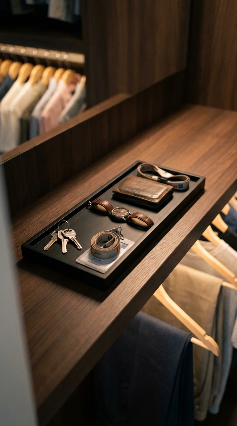 Put a tray or bin for keys, watch, wallet, badges—anything that vanishes.