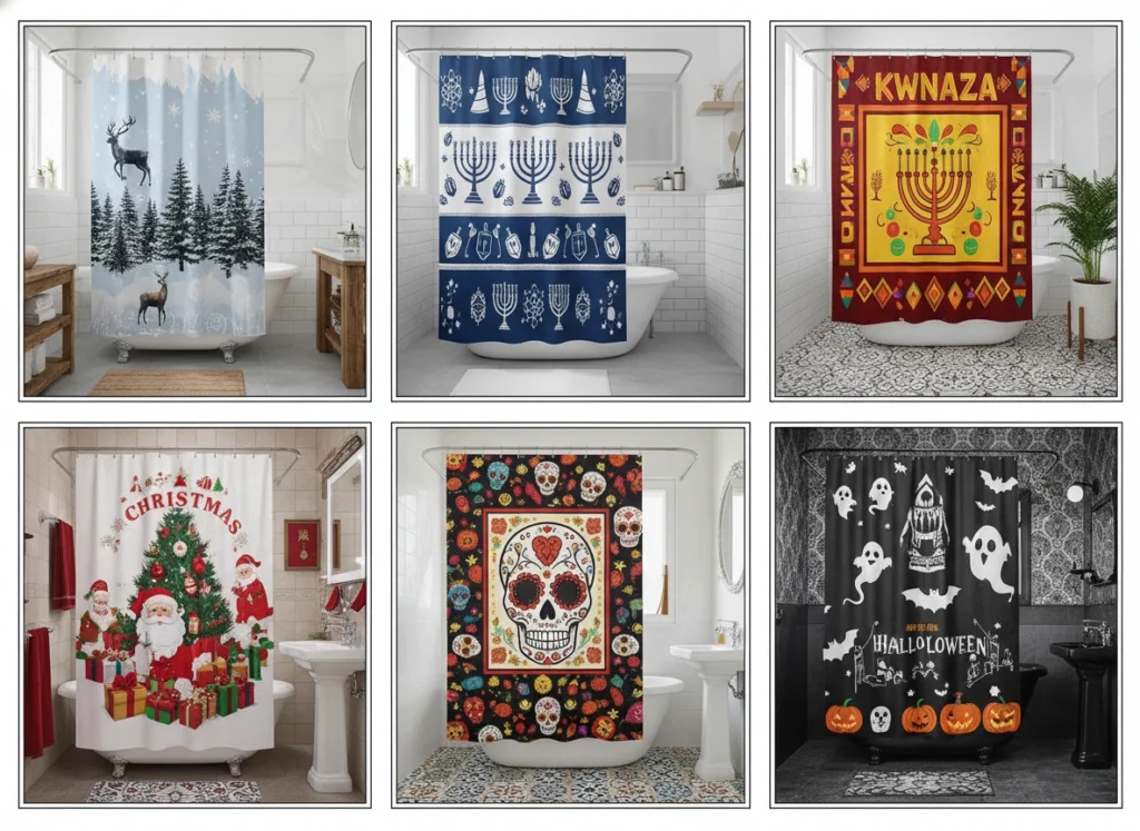 The examples in the image show just how varied holiday styles can be. From serene winter forests to bright Christmas illustrations and cultural celebrations, customization makes it easy to choose a curtain that reflects your traditions. This flexibility helps you create a bathroom that feels welcoming to guests and joyful for your family.