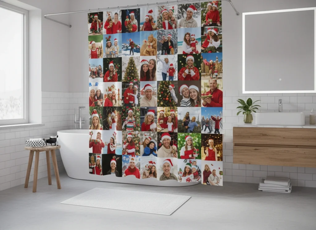 A photo collage shower curtain turns your bathroom into a joyful, memory-filled space. It’s one of the most personal holiday décor choices you can make, because the images you select—family portraits, winter adventures, or silly festive snapshots—instantly create warmth and emotional connection. Guests can’t help but smile when they see familiar faces woven into the holiday atmosphere.