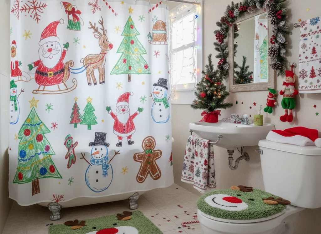To keep the look cohesive, you can pull a few colors from the doodles—like red, green, or blue—into your towels, bath mats, or small decorations. Handmade ornaments, felt characters, and soft lighting complement the playful style without overwhelming the room. It’s a wonderful choice for family bathrooms or any space where you want the season to feel extra cheerful.