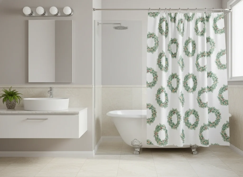 Greenery-based designs offer a gentle, timeless way to bring the holidays into your bathroom without overwhelming the space. A wreath-print curtain introduces soft greens and delicate textures that feel festive but refined. It’s the perfect option if you love holiday décor that whispers rather than shouts.