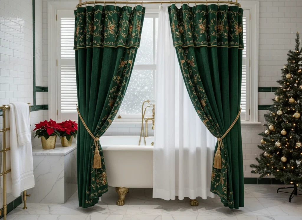 The dramatic green drapes shown here frame the tub and give the room a warm, festive richness. Gold tiebacks, hardware, or subtle metallic accents help elevate the look even further. If you love sophisticated holiday décor, this approach turns your shower into a true focal point.