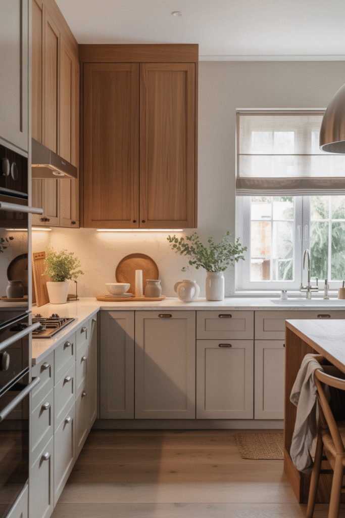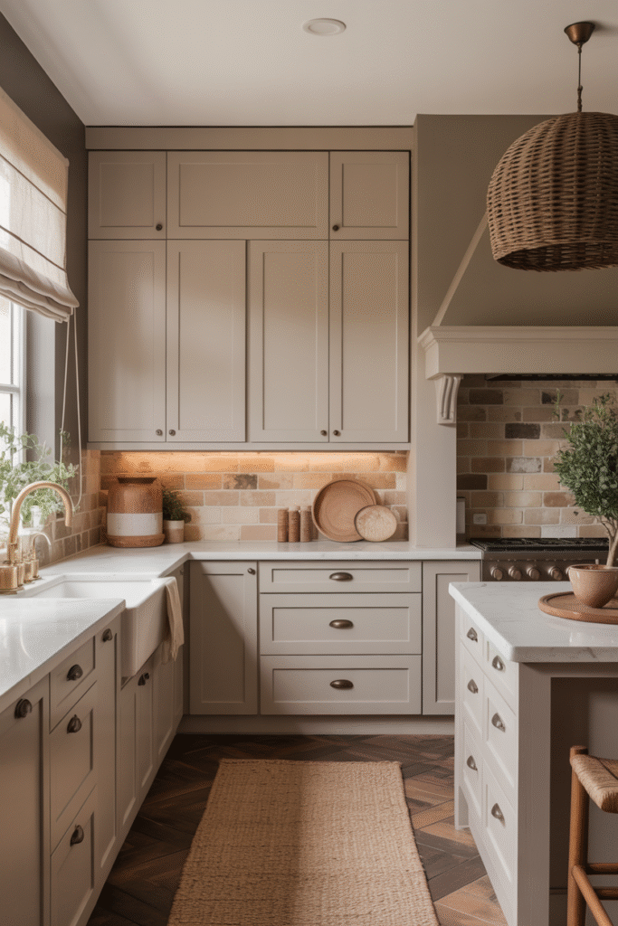 When gray feels too cool and beige too golden, greige becomes the happy medium. Use a warm greige base on walls (LRV around 60) and soft warm white cabinets to achieve contrast that’s subtle but layered. Natural stone backsplashes — especially those with cream or sand veining — add depth.