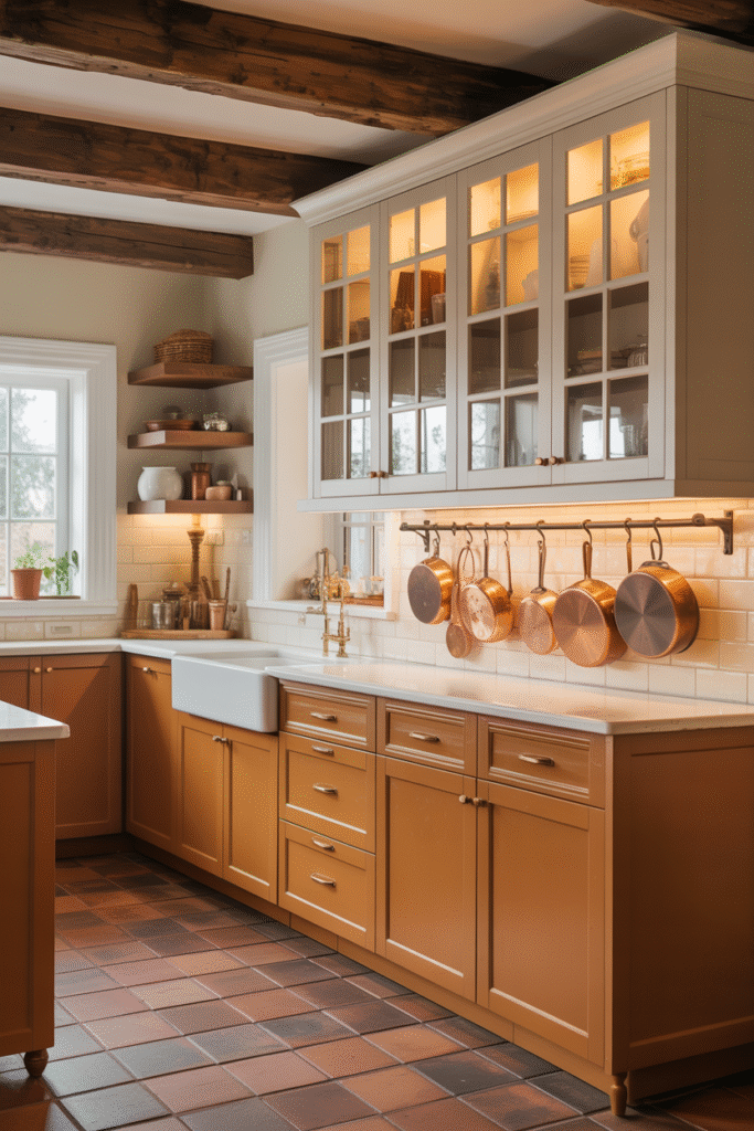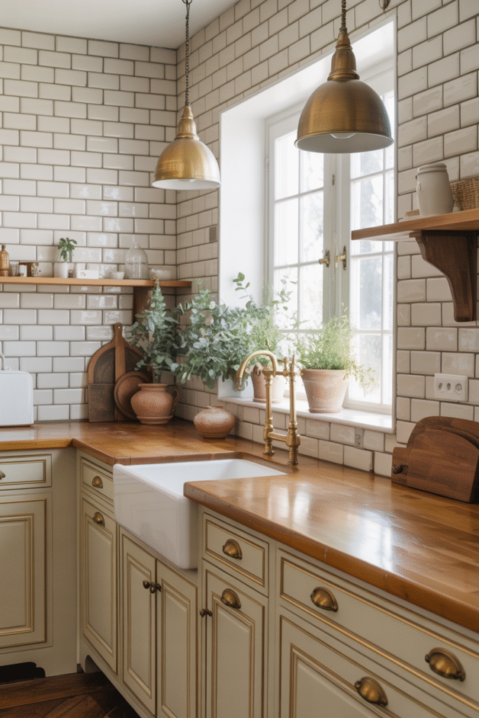Creamy whites radiate softness and make small kitchens appear more expansive. When layered with aged brass fixtures, butcher-block countertops, and subtle beige grout lines, the effect is timelessly elegant.