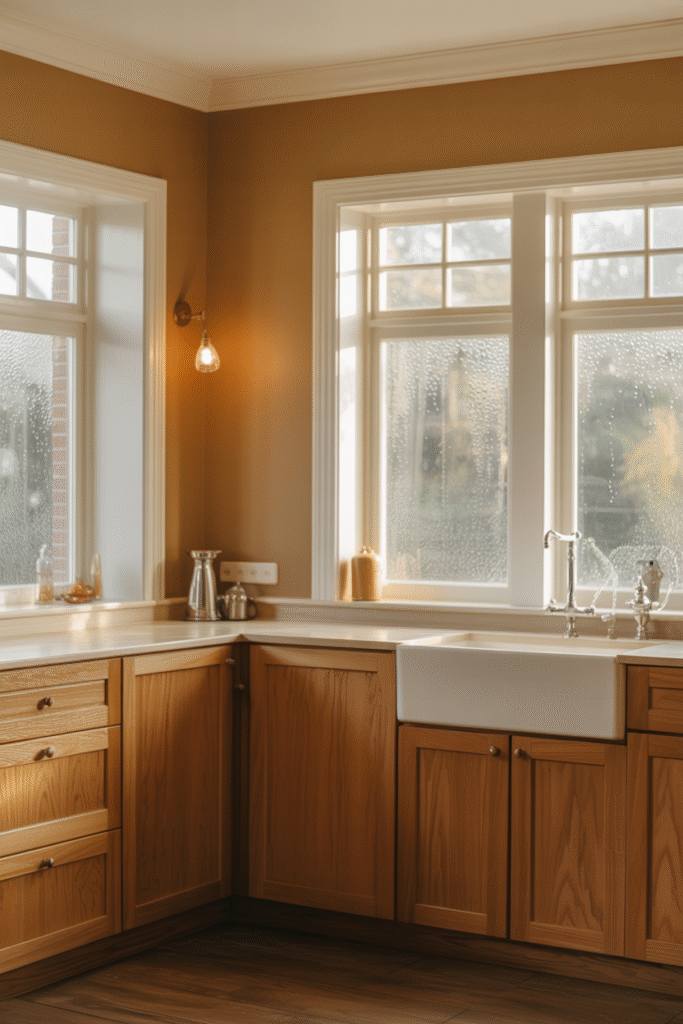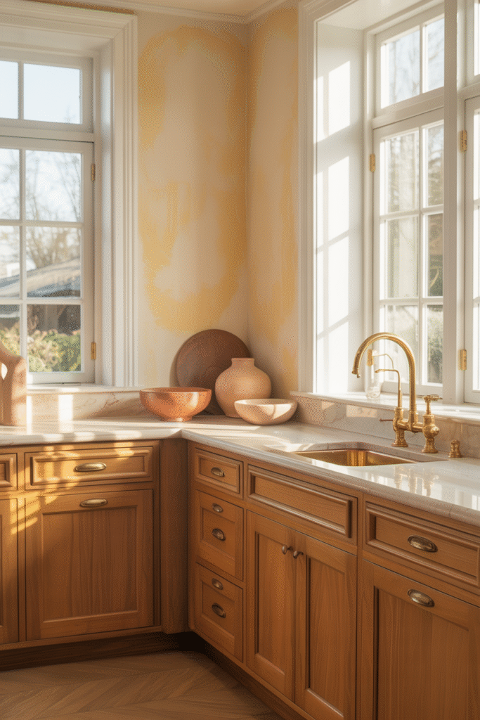 A pairing that captures the warmth of sunlight on wood floors, this palette revolves around a creamy soft linen wall color (think neutral with a whisper of yellow undertone) and honey oak cabinetry. Touches of brushed brass hardware and warm marble or quartz countertops elevate the look without overwhelming it.
