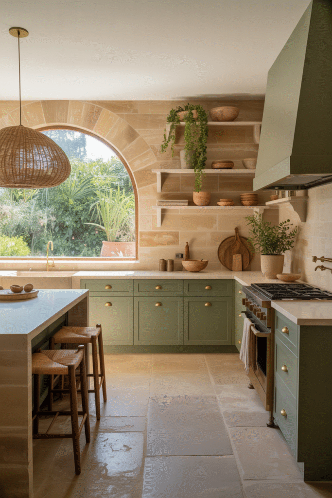 This earthy blend channels nature’s calm. Sandstone walls and sage cabinetry form a grounded palette that feels organic yet elevated. The muted green adds color while staying within the neutral family.