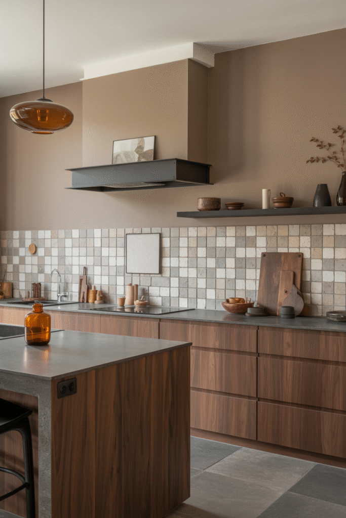 For kitchens where sleek meets soul, this combo pairs a warm taupe wall with smoky gray stone countertops and dark walnut cabinetry. The look feels grounded but not heavy — ideal for open-concept spaces.