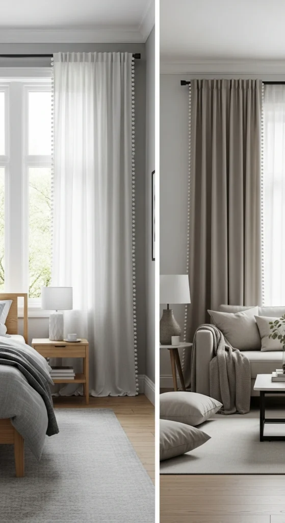 Color strategy plays a surprisingly big role. If you want a gentle, grown-up look, go for tone-on-tone pom-poms that softly blend into the fabric. If your space needs energy, choose a contrasting pom color that echoes another accent nearby—like a cushion or rug. Bedrooms often benefit from calmer palettes, especially if you use blackout lining behind the fabric for better rest. Living rooms, on the other hand, give you more freedom to experiment with transparency, light filtering, and bolder trims.