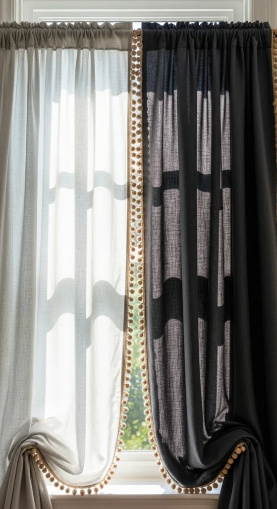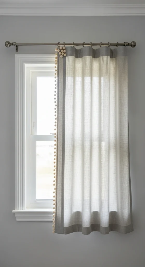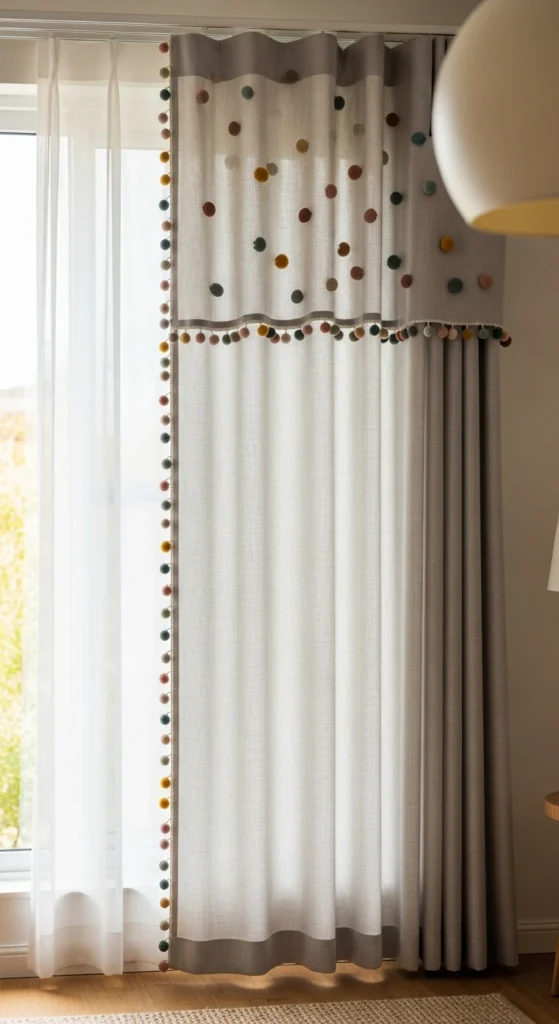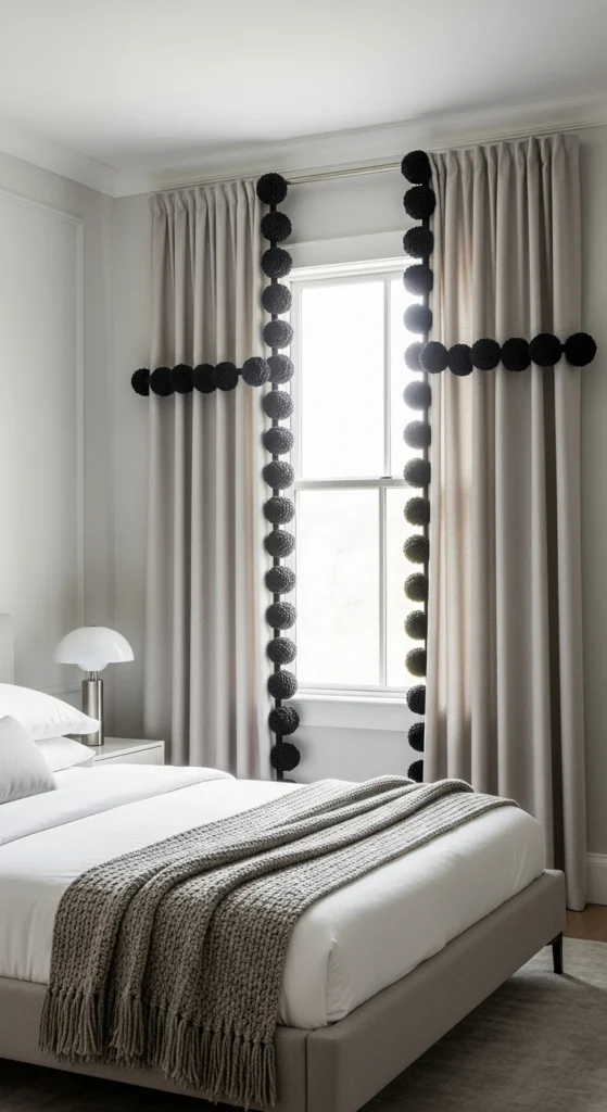 Neutral curtains create a calm foundation, but a bold, high-contrast pom-pom edge instantly wakes up the room. Think warm greige or soft oatmeal fabric paired with charcoal, cinnamon, or deep navy pom-poms. The edge becomes a crisp border that feels playful in the best possible way.