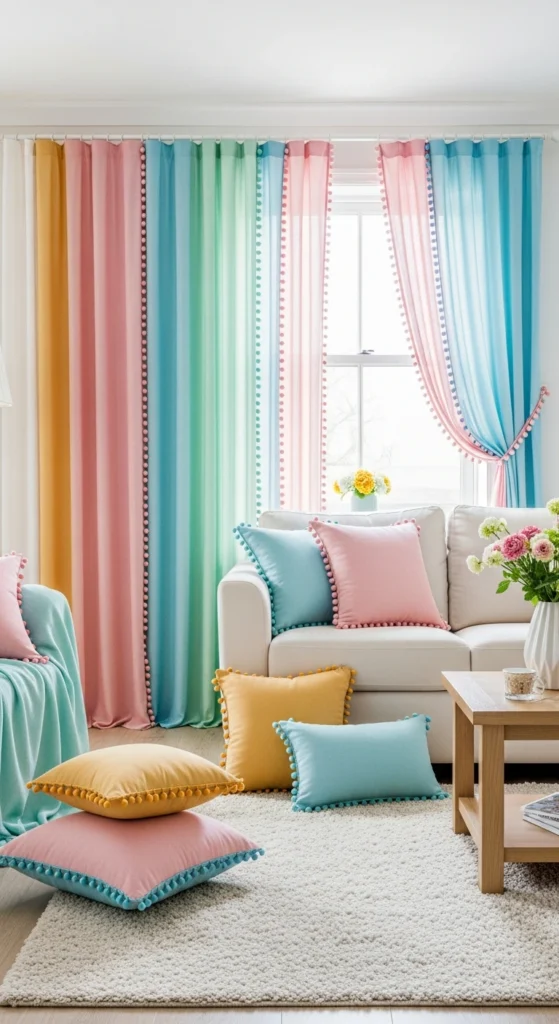 Matching your pom-pom edge to accents already in the room creates a look that feels intentional instead of accidental. When cushions, throws, or artwork repeat the same color as the curtain trim, the whole space suddenly feels pulled together—even if you didn’t change anything else. It’s a simple design trick with big visual payoff.