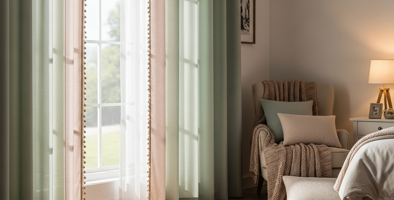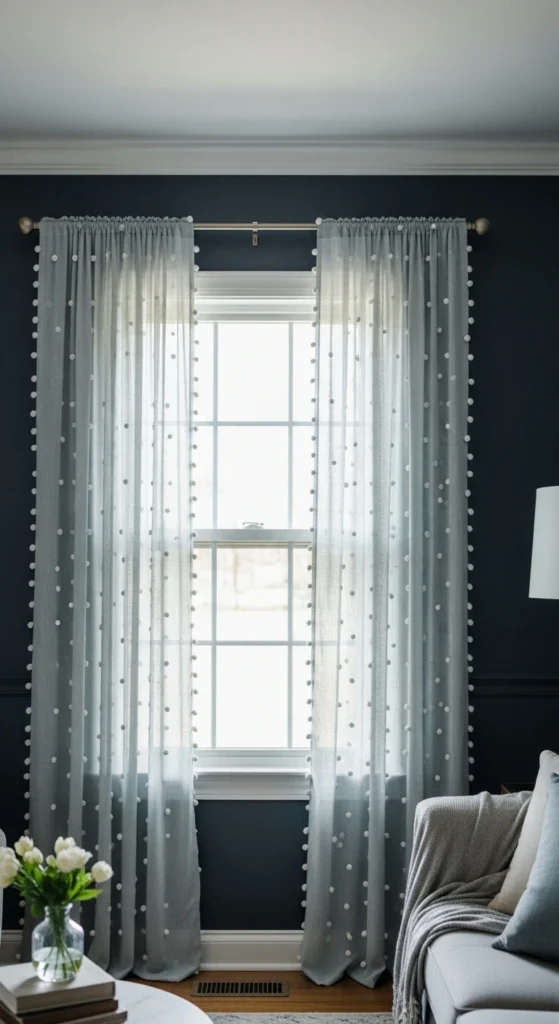 Light pom-pom leading edge curtains soften a room instantly, but pairing them with a deeper wall color behind adds dimension you can feel as soon as you walk in. The contrast creates a layered, designer look without any complicated styling. The curtain stays airy and calm, while the wall brings depth—kind of like a quiet friend standing next to someone confidently bold.