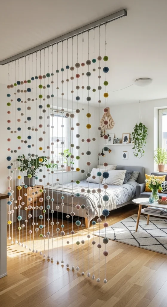 Pom-pom curtains make delightful room dividers, especially in studios or shared bedrooms where you want separation without blocking light. When hung from a ceiling track, the strands fall like a soft, textured veil—giving you privacy while still keeping the space open and friendly. It’s practical, but also undeniably fun.