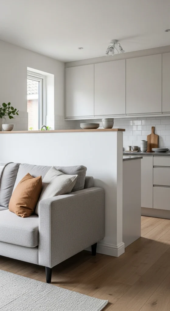 A partition helps you zone the room so the kitchen can be practical while the living area stays relaxing. You still see and talk to each other, but the spaces don’t visually bleed into one messy scene.