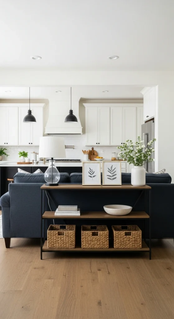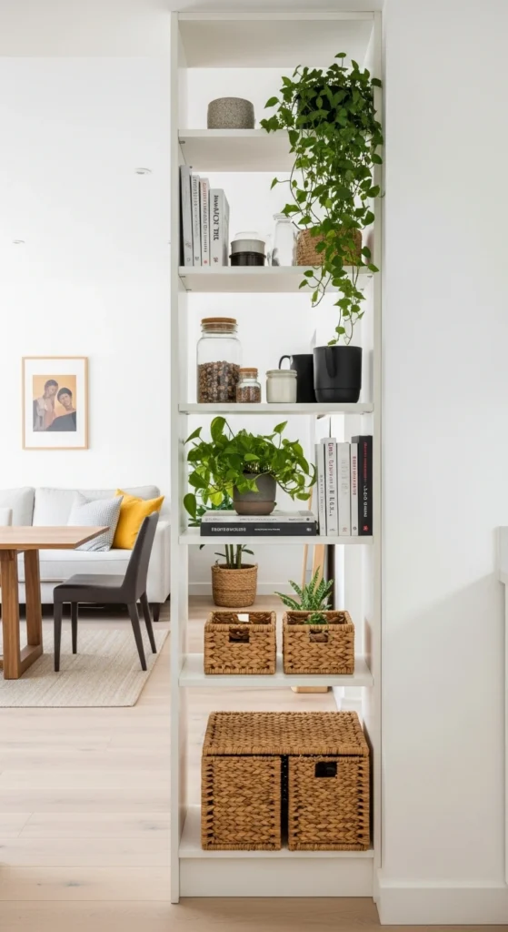 Place a shelving unit between the kitchen and living area, and you instantly get a visual boundary that still feels airy. You can reach items from both sides, and the decor becomes part of both spaces.