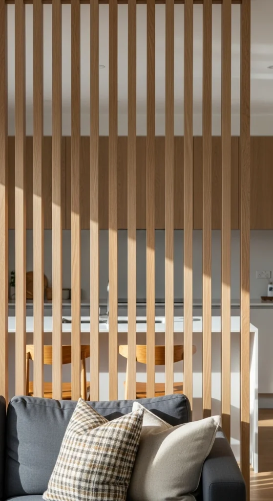 Wood slats or vertical screens are a stylish way to create a partition that feels modern and light. They block just enough to define areas while keeping airflow and a sense of openness.