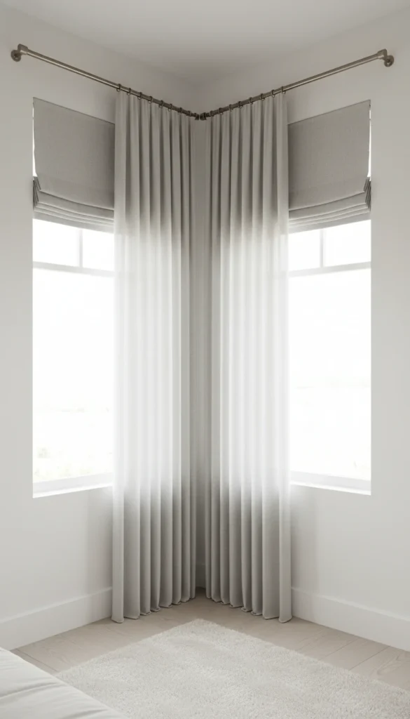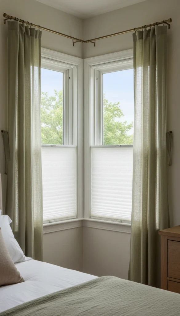 Bedrooms need privacy, especially with corner windows that can face multiple directions or neighboring buildings. The trick is layering.