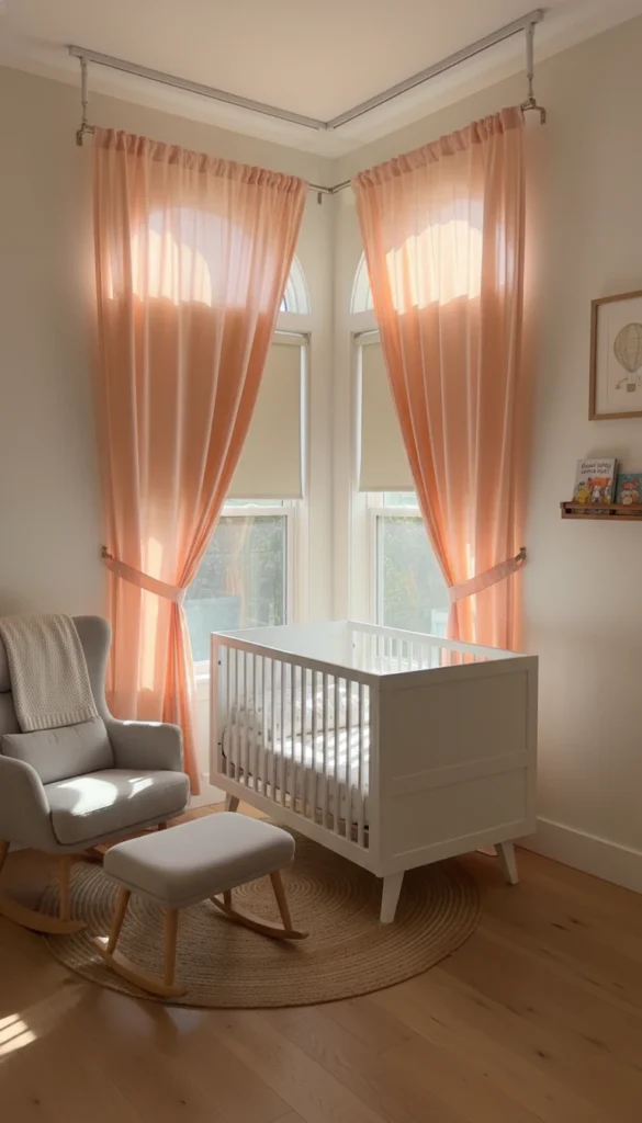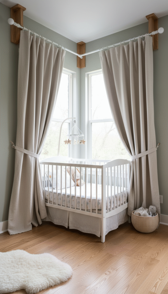 For nursery ideas, corner curtain rod ideas can feel playful and gentle. A compact L-shaped rod mounted above a corner window can frame the crib area with soft, breathable fabric.