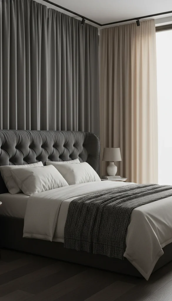 - Choose curtains slightly darker than the walls to visually anchor the bed area.