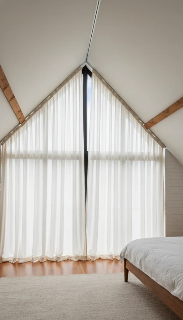 A slim custom track installed along the slanted ceiling or upper edge of the triangle allows light, gauzy panels to fall straight down. This softens sharp angles and brings romance to the architecture.