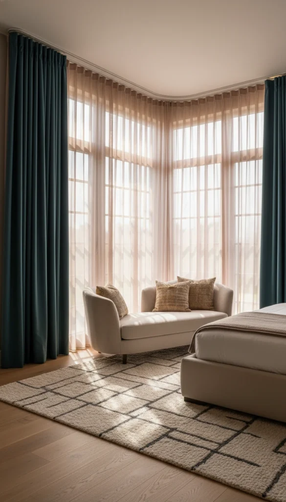 - Layer sheer panels in a lighter tone in front so the window never feels harsh when open.