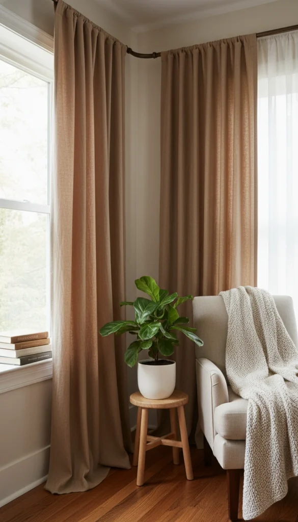 - Layered textures: Mix a slightly slubby linen curtain with a smoother blackout liner and a nubby wool throw on the nearby chair so the whole corner feels tactile.