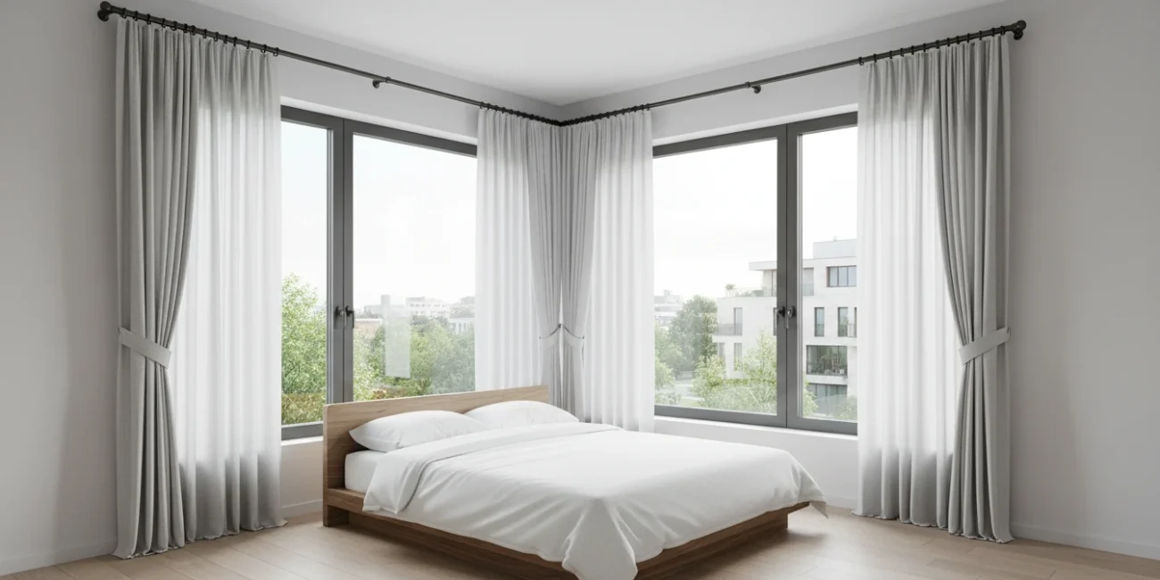A corner window in a bedroom feels a bit like a design plot twist. Beautiful natural light? Yes. Gorgeous views? Usually. But then you try to hang curtains and suddenly the rod stops in a weird place, the panels bunch oddly in the corner, and privacy feels… uncertain.