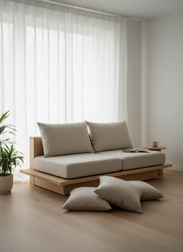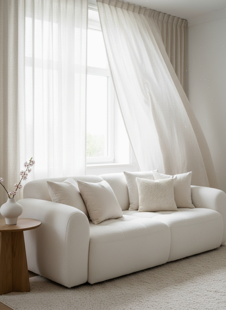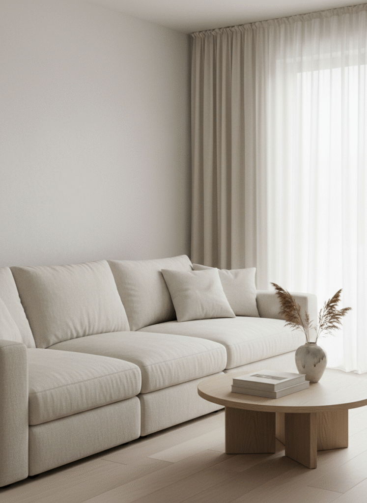 Focus on essential comfort without clutter. An extra-large, low-slung sofa in a neutral tone takes center stage, paired with a simple coffee table. Unlined natural cotton curtains in a light shade provide privacy and a soft diffusion of light, maintaining a peaceful, uncluttered aesthetic. Benefit: Promotes relaxation and mental clarity. Tip: Keep decor sparse and intentional.