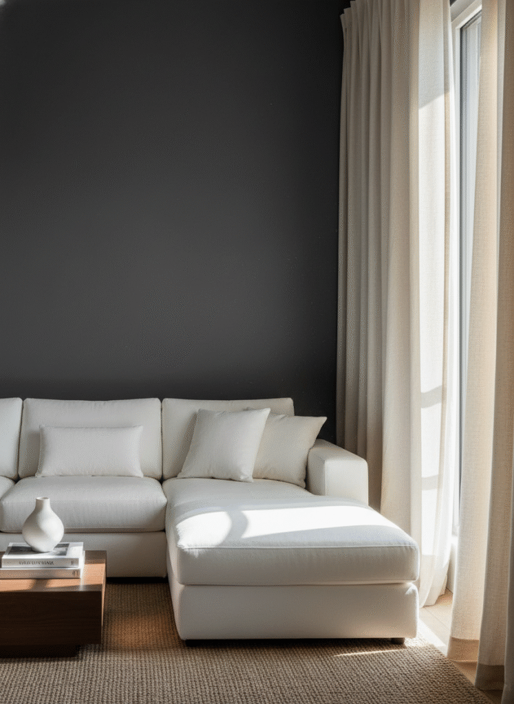 Explore a bolder palette with deep charcoal or navy walls. This dramatic backdrop makes lighter elements pop, like a crisp white sectional. Floor-to-ceiling unlined linen drapes in a light grey or off-white soften the intensity, drawing the eye upwards. Benefit: Adds sophistication and visual intrigue. Tip: Use strategic lighting to highlight features.