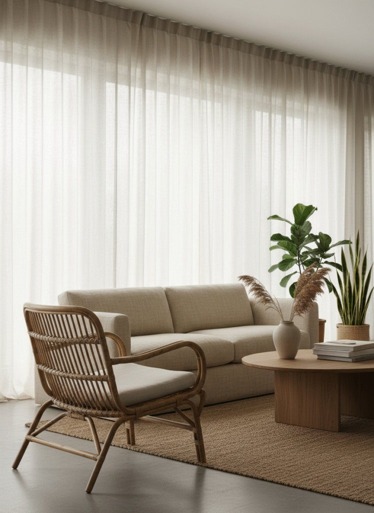 Merge free-spirited bohemian textures with clean modern lines. Think a rattan accent chair next to a structured sofa. Flowing natural linen curtains in an unbleached tone add an airy, relaxed feel, perfectly complementing macrame wall art or a woven pouf. Benefit: Achieves a curated, eclectic yet refined look. Tip: Mix patterns subtly for visual interest.