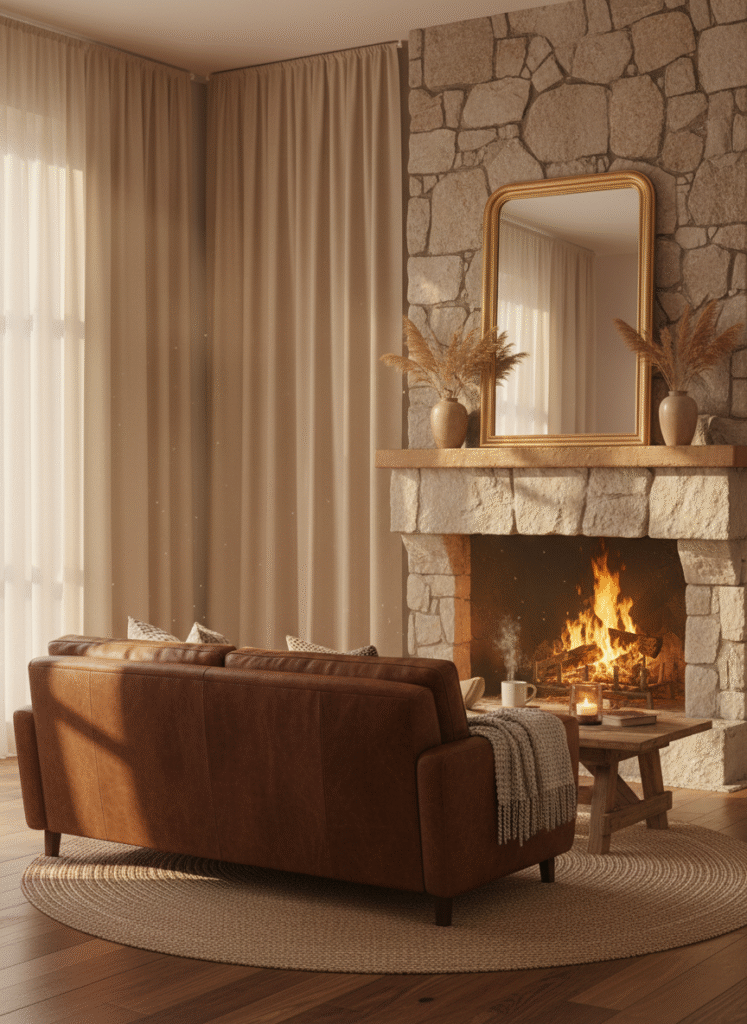 Combine natural elements like stone or reclaimed wood with contemporary comforts. A grand fireplace becomes the focal point, flanked by a deep-seated leather sofa. Creamy beige thermal curtains provide a soft backdrop, enhancing the room’s inviting, lodge-like ambiance. Benefit: Creates a warm, grounded, and luxurious feel. Tip: Layer sheepskin rugs for ultimate coziness.